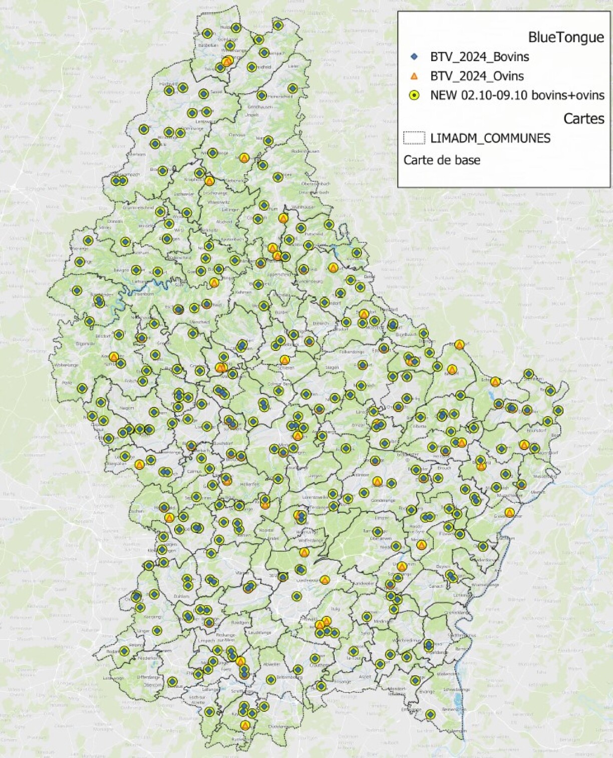 D’Veterinärs- a Liewensmëttelverwaltung ALVA deelt e Mëttwoch mat, datt bannent der leschter Woch 132 weider Déiere positiv op d’Blo-Zonge-Kränkt getest goufen. Ausserdeem wier d’Krankheet a weider 13 Betriber duerch Labo-Analysen nogewise ginn.