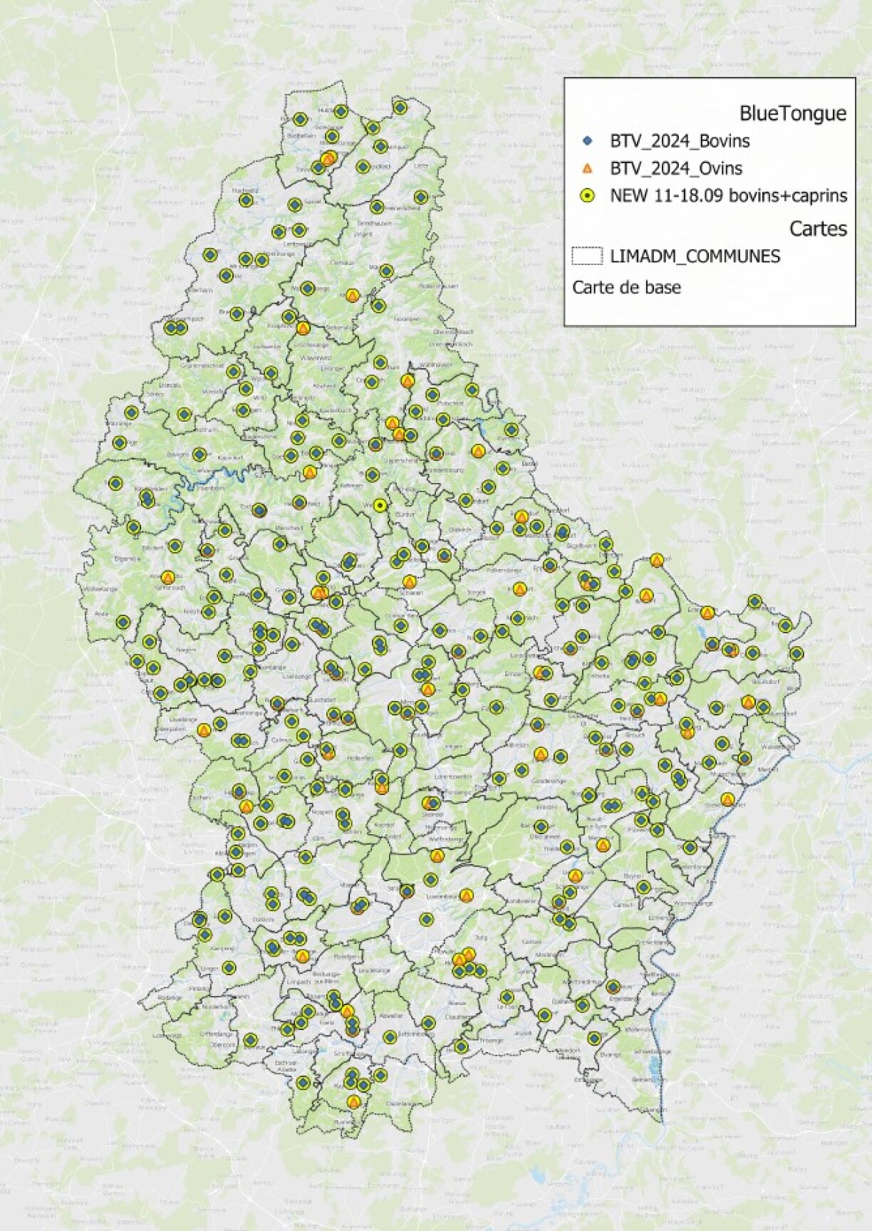 D’Veterinärs- a Liewensmëttelverwaltung ALVA deelt e Mëttwoch mat, datt bannent der leschter Woch 98 weider Déiere positiv op d’Blo-Zonge-Kränkt getest goufen. Ausserdeem wier d’Krankheet a weider 26 Betriber duerch Labo-Analysen nogewise ginn.