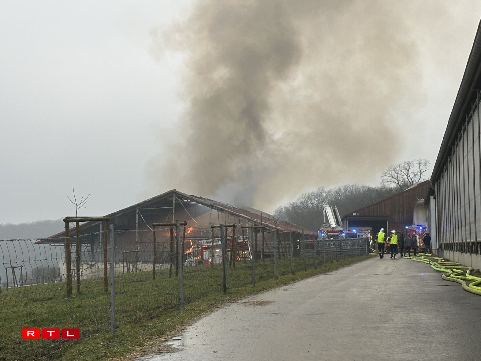 Wéi et vum Proprietär vum Haff heescht, hätt e Camion, deen eng Liwwerung Fudder fir d’Béischten op den Haff bruecht huet, Feier gefaangen. Dëst hätt duerno op en Hangar iwwergegraff, an deem Heebotte leien.