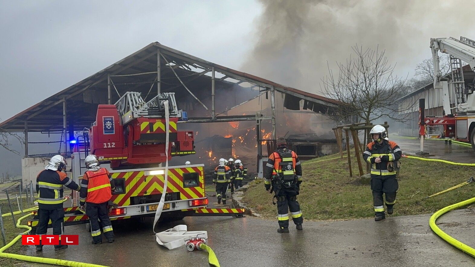 Wéi et am Bulletin vum CGDIS heescht, si 65 Pompjeeën op der Plaz, fir d’Feier ënner Kontroll ze kréien.