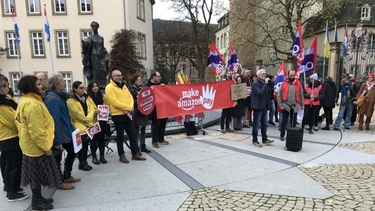 Vu Lëtzebuerg aus géing um Réck vun de Lager-Aarbechter an Aarbechterinne fett akasséiert ginn. Amazon géing iwwer 50 Milliarden Euro Ëmsaz d’Joer maachen, ma duerch den europäesche Sëtz am Grand-Duché kaum Steiere bezuelen, sou de Jean-Claude Thummel vun déi Lénk, deen d’Manifestatioun mat organiséiert huet: