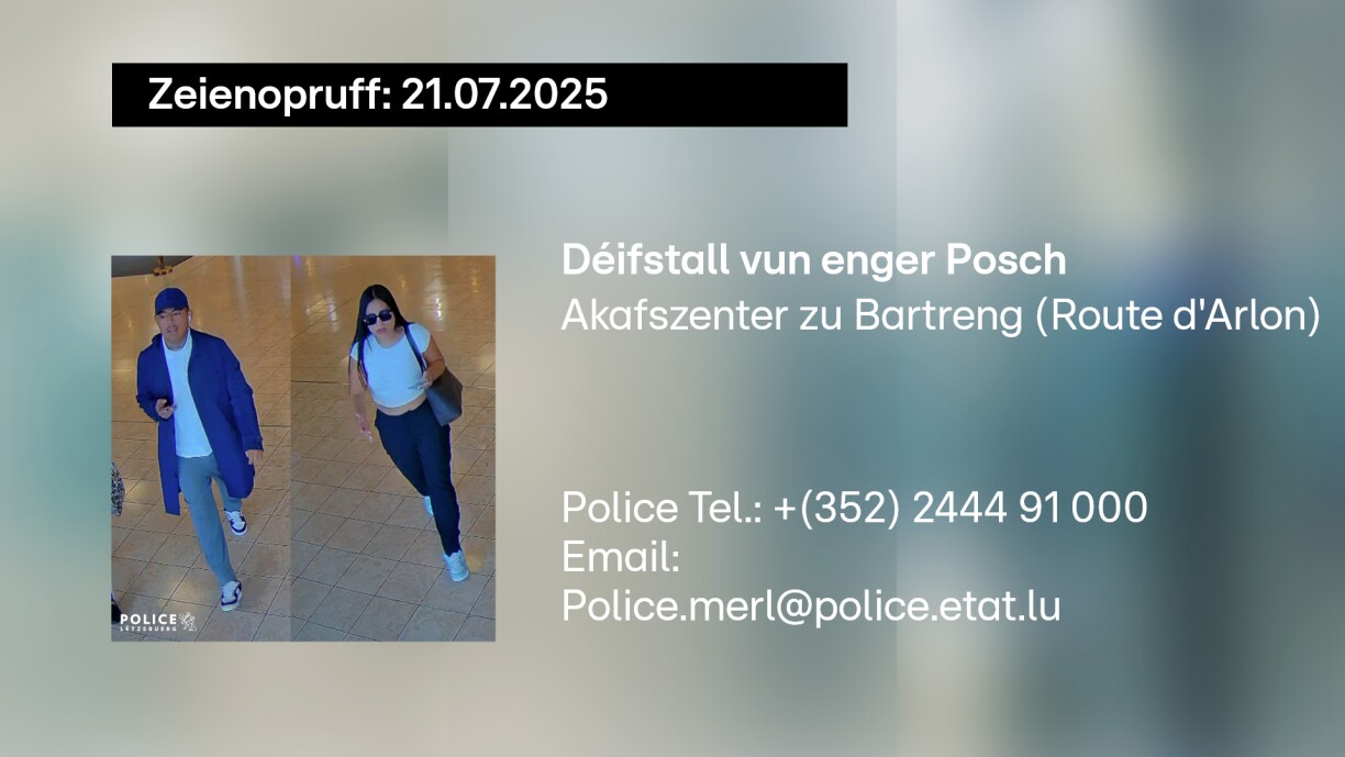 Konkreet geet et ëm eng Posch, déi den 21. Juli 2025 geklaut gouf. Wien déi zwou Persounen op der Foto identifizéiere kann, ass gebieden, sech beim Policebüro Märel/Belair ze mellen, dat ënnert der Nummer (+352) 2444 91 000 oder per Mail u Police.merl@police.etat.lu.