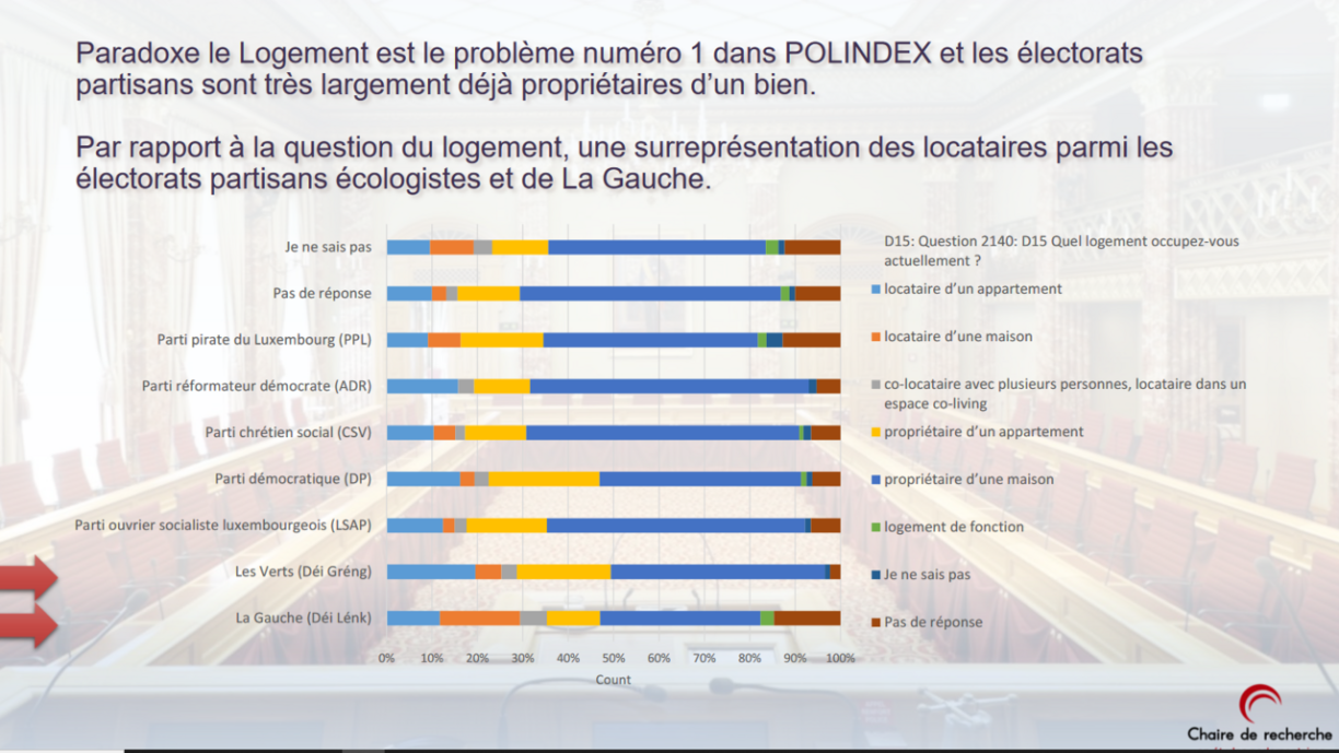 Dat war den Dauerbrenner Logement. An et muss ee keen Hellseher sinn, fir virauszesoen, datt dat och dëst Joer rëm de Fall dierft sinn. Virun deem Hannergrond ass awer interessant, datt bei den Unhänger vun deenen eenzele Parteien zu engem gudden Deel Proprietäre sinn. Woubäi méi Leit een Haus wéi een Appartement besëtzen. Eenzeg bei den Unhänger vun deene Gréngen an deene Lénke sinn déi Leit, déi lounen, iwwerrepresentéiert.