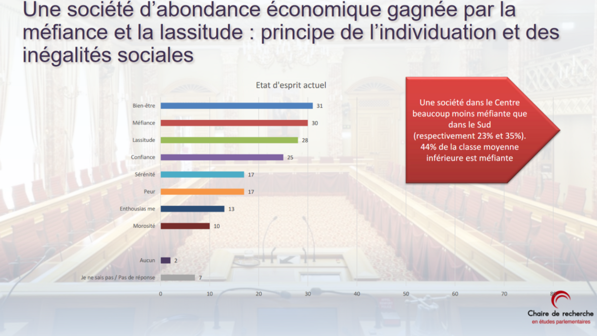Dem Politologe Philippe Poirier no zitt sech déi Polariséierung duerch dräi Gruppen. Eng Kéier ginn et eng ënnerschiddlech Bewäertung jee no Alter, jee no Revenu an jee nodeems, wou ee wunnt. Wat den Alter ugeet, sou wiere virum allem déi Eeler mësstrauesch, déi Leit, déi mat 2 Been am Liewe stinn, virun allem déi am Alter tëscht 35 a 50 Joer, sinn am zefriddensten.
