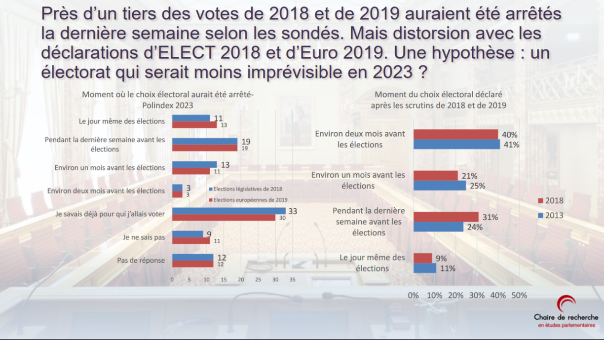 Wat den Zäitpunkt vun der Entscheedung ubelaangt, sou wosste bei den Europawalen 2019 respektiv bei de Chamberwalen 2018 schonn 30 respektiv 33 Prozent vun de Leit vun Ufank un, wie se wiele géingen a jee 3 Prozent wossten et 2 Méint virdrun. Wann dat dëst Joer erëm sou ass, huet de Walkampf also op d’Decisioun vun iwwert engem Drëttel vun de Wieler keen Impakt. Bei den Nationalwalen 2018 hu sech 13 Prozent vun de Wieler ongeféier ee Mount virdrun decidéiert, 19 Prozent wärend der leschter Woch an esouguer 11 Prozent réischt um Waldag selwer. Wann ee weess, datt et grad bei de Reschtsëtz dacks op just e puer Stëmmen ukënnt, hunn d’Parteien also besser, bis zum Schluss alles ze ginn.
