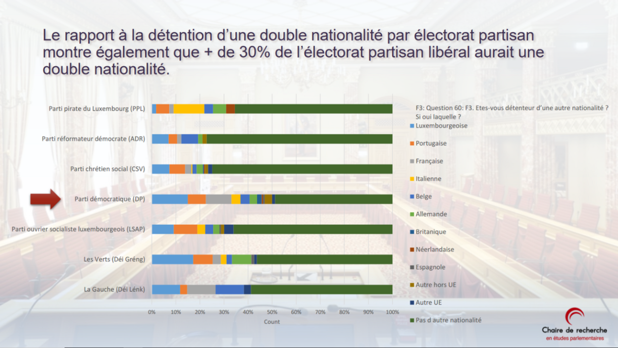 Nee, dat kann een net wierklech. D’Supporter vun de Parteie sinn op d’mannst, wann net esouguer nach ee Krack méi ënnerschiddlech, wéi déi verschidde Parteien selwer. Dat heescht et gi Gemeinsamkeeten awer och grouss Ënnerscheeder. Sou beispillsweis bei der Hierkonft. D’DP ass am Internationaalsten opgestallt. Bal 35 Prozent vun de liberalen Unhänger sinn net am Grand-Duché gebuer, ronn 30 Prozent hunn déi duebel Nationalitéit. Bei deenen, déi am Ausland gebuer goufen, fält op, datt déi, déi ursprénglech aus der Belsch a Frankräich kommen, iwwerrepresentéiert sinn. Vun den Analysten ass et d’Umierkung, datt dee Fait duerchaus een direkten Impakt op d’Performance vun der DP am Walbezierk Zentrum kéint hunn. D’Piraten, déi Lénk an d’CSV hunn iwwerdeems déi meeschte Wieler, déi och zu Lëtzebuerg gebuer sinn.