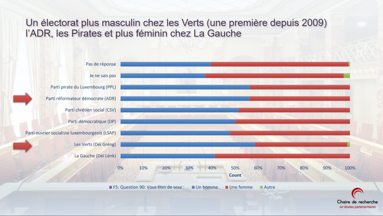Wat d’Opdeelung no de Geschlechter ugeet, sinn d’Supporter vun deene Gréngen, der ADR an de Piraten am männlechsten. Bei deene Gréngen ass et fir d’éischte Kéier zanter 2009, datt méi Männer wéi Frae sech zu hinne bekennen. Si sinn iwwerdeems och déi eenzeg Partei, wou een Deel vun den Unhänger uginn huet, weder Mann nach Fra ze sinn. Mat bal 60 Prozent fanne sech kloer am meeschte Frae ënnert den Unhänger vun deene Lénken.
