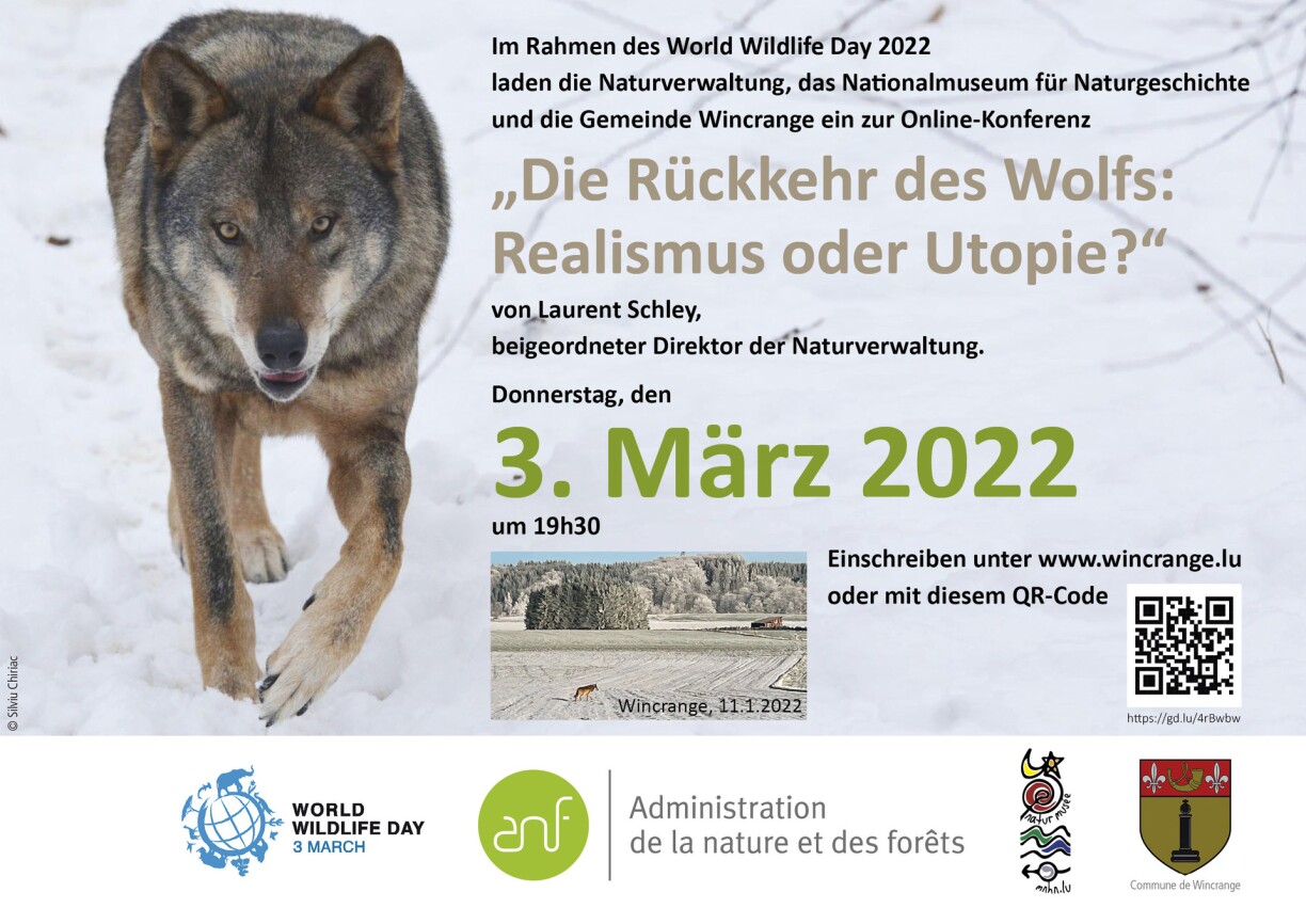 Zu einem Vortrag mit dem Titel „Koexistenz Mensch-Wolf: Realismus oder Utopie?” von Dr. Laurent Schley laden die Naturverwaltung, das Nationalmuseum für Naturgeschichte und die Gemeindeverwaltung Wintger am 3. März 2022 ein, dem World Wildlife Day. Anlass ist die Wolfssichtung am 11. Januar 2022 in Wintger. Der Vortrag findet online und in luxemburgischer Sprache statt. Einschreiben kann man sich unter diesem Link: https://gd.lu/4rBwbw oder mittels des angehängten QR-Code.