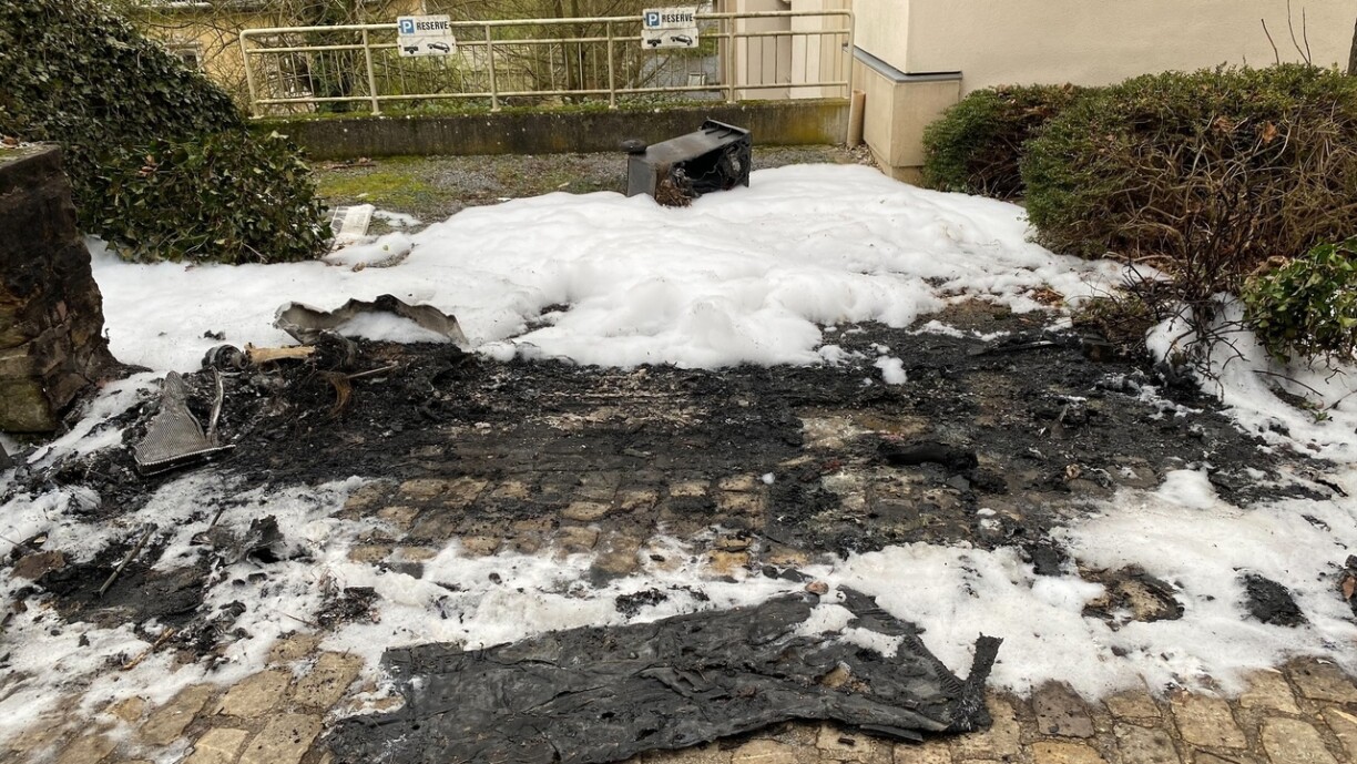 Den Auto ass a Flamen opgaangen a komplett ausgebrannt. Wéi d’Police präziséiert, ass en héije Schued entstanen. De Chauffer ass nom Virfall ze Fouss geflücht. Hie wäert am weidere Verlaf vun den Ënnersichungen ermëttelt ginn.