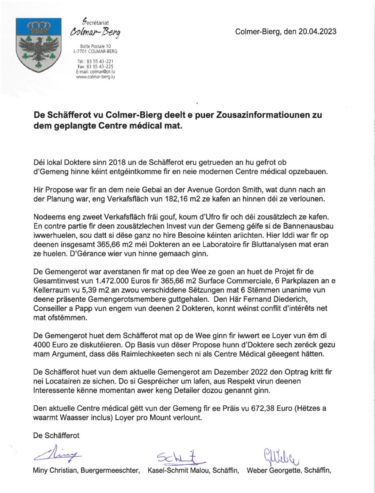Den aktuelle Schäfferot reagéiert mat engem Communiqué op dësen Artikel. Am Schreiwes gëtt de Verlaf vum “Dossier Centre médical” aus der Siicht vun der Gemeng nogezeechent. Et ginn och Prezisiounen zum Loyer, deen d’Dokteren fir dat aktuellt Gebai bezuele mussen.
