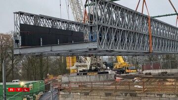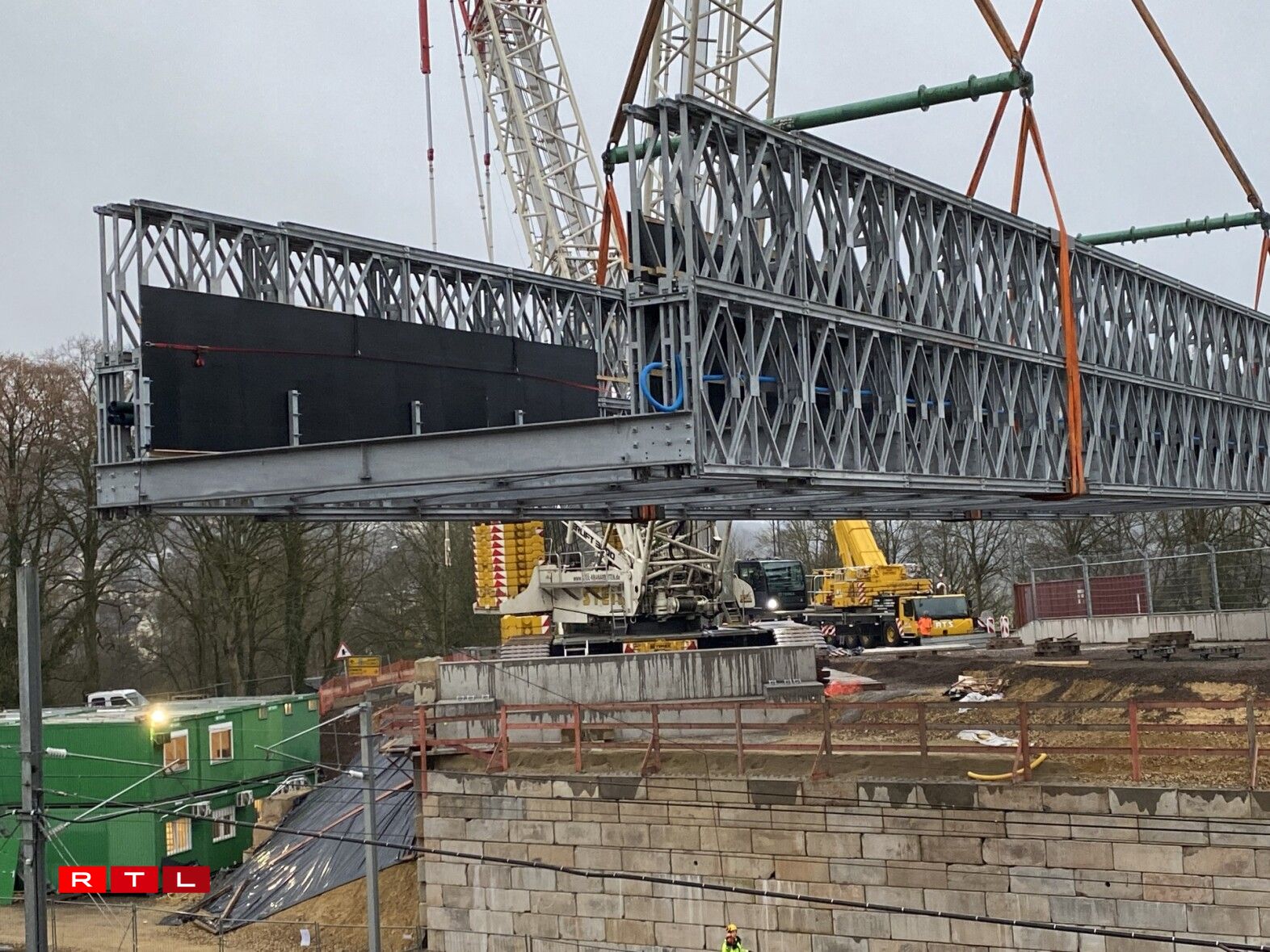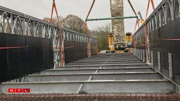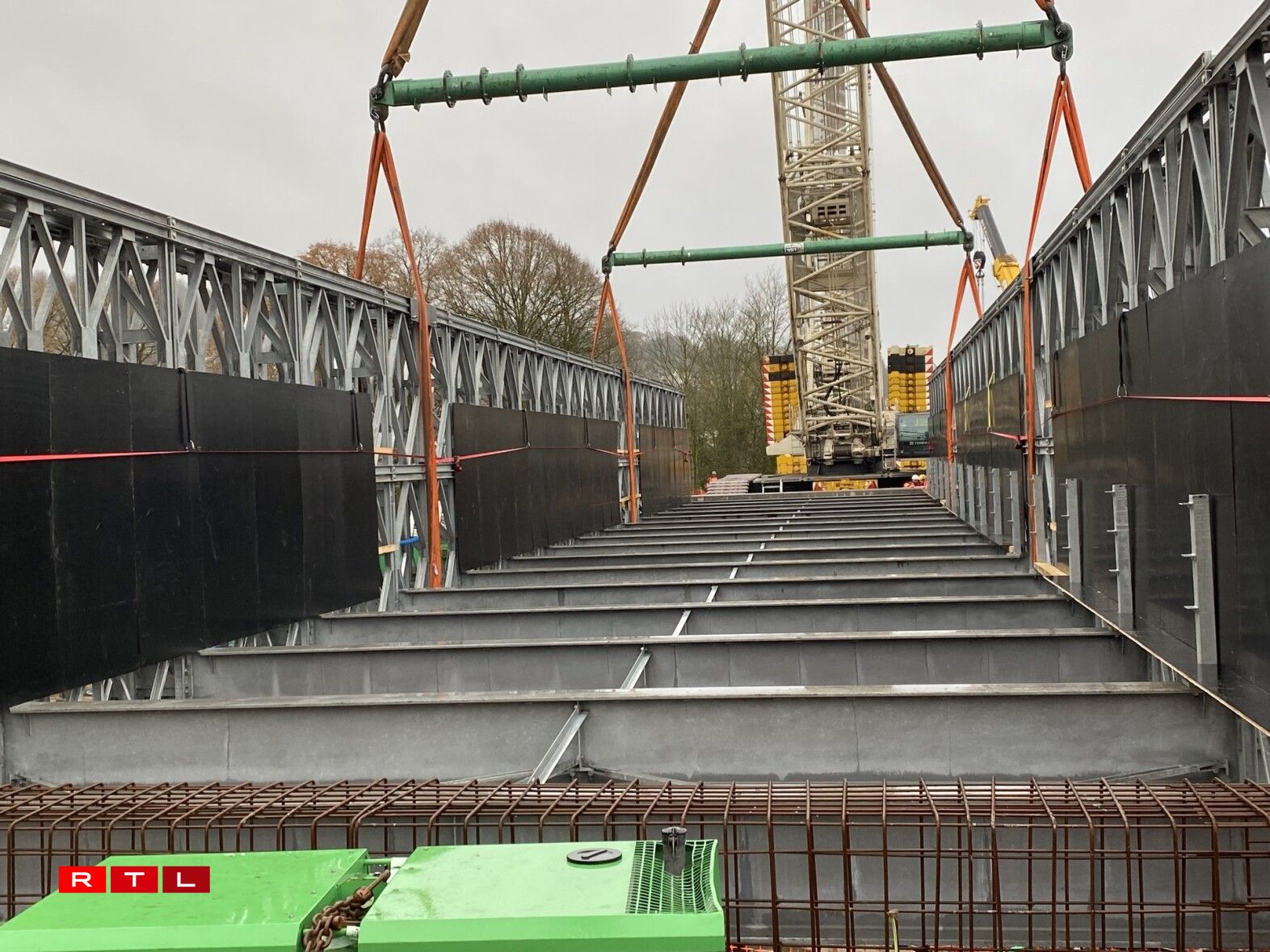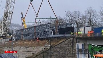 Un den zwee groussen Äerm vun dësem Kran hänkt déi 160 Tonne schwéier Bréck, déi a Wales bestallt gouf, an Deeler geliwwert an hei zu Lëtzebuerg zesummegesat gouf. Dës lescht Aarbechten hunn 2 Méint gedauert. Déi nei provisoresch Bréck geet iwwert d’Eisebunn tëscht Colmer Bierg an Ettelbréck a Mëtt Mäerz wäerten déi éischt Autoen driwwer fueren.