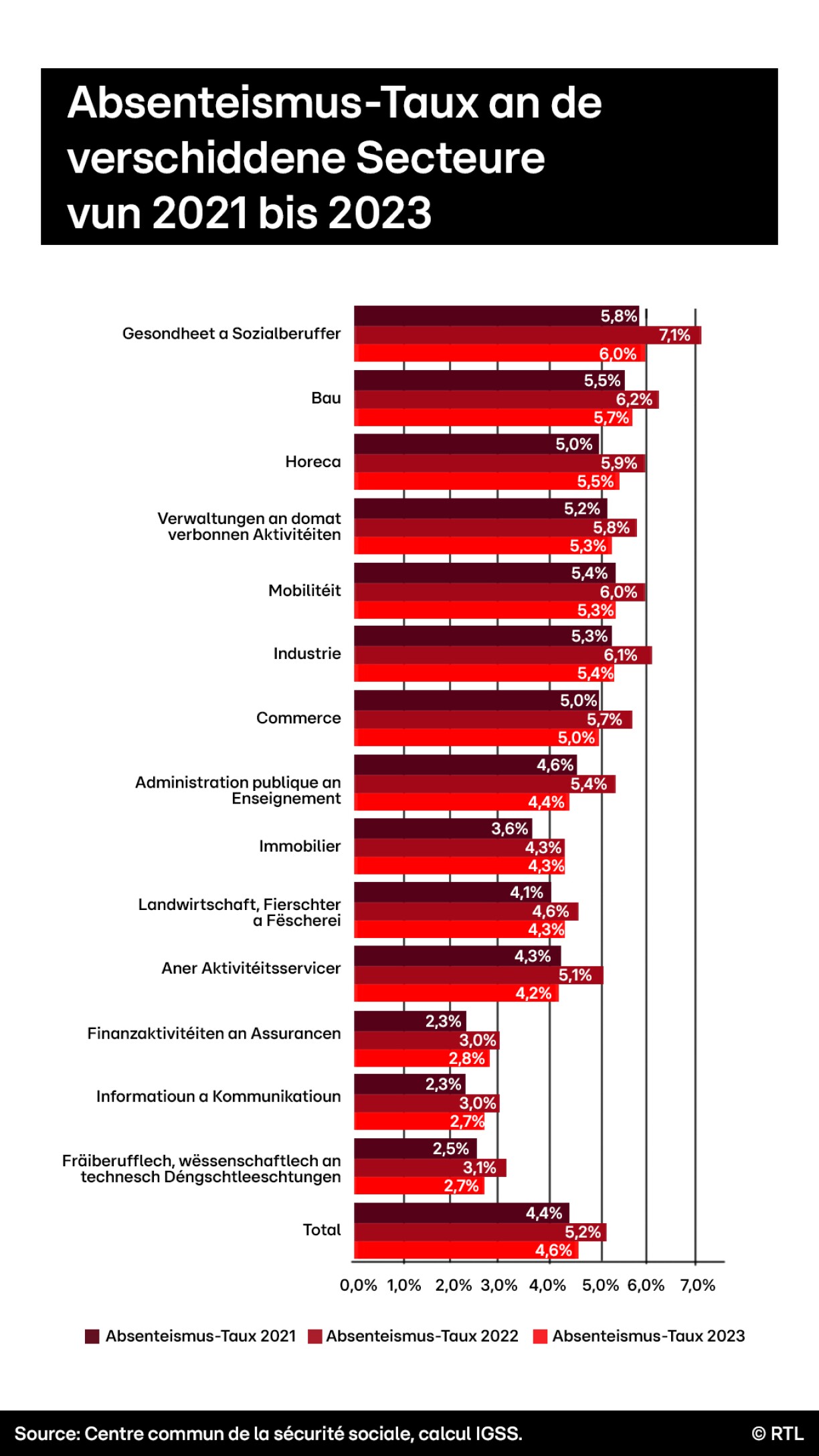 D’Santé an d’Sozialberuffer sinn déi Secteuren, an deenen den Absenteismus mat 6% 2023 am héchste war. Dat läit dorunner, datt d’Mataarbechter engersäits méi ustiechende Krankheeten ausgesat sinn an anerersäits aus Precautioun éischter doheem bleiwen. Duerno kommen de Bau an den Horecasecteur.