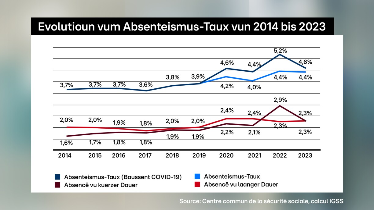 Aus de leschten offizielle Statistiken iwwer den Absenteismus vum Santés- a Sécurité sociales-Ministère zesumme mat der Inspection générale de la sécurité sociale (IGSS) kann ee sou eng Progressioun allerdéngs net erausliesen. Déi lescht offiziell Chifferen, déi am Oktober zejoert verëffentlecht gi sinn, erfaassen d’Krankschreiwungen am Privatsecteur bis 2023 mat. Dat Joer louch den Absenteismus bei 4,6% an ass domadder ëm 11% par rapport zum Joer virdrun erofgaangen.