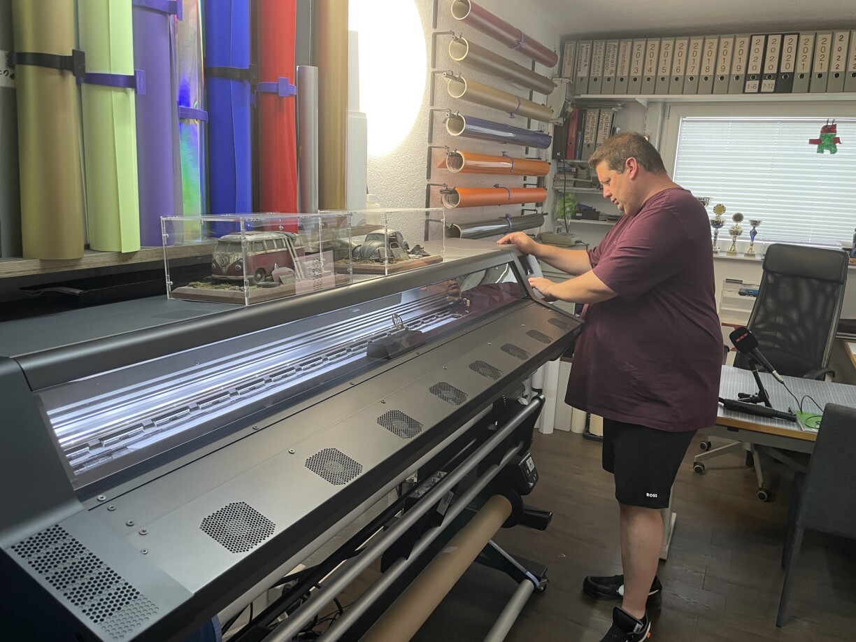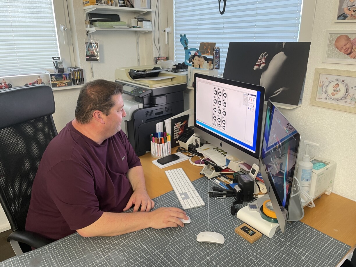De Gilles hat 2013 mat enger eenzeger Maschinn kleng ugefaangen an huet sech ëmmer weider vergréissert. Elo ass hie mat senger Firma um Punkt ukomm, datt him d’Plaz ausgeet. “Ech hu Geräter an der Garage stoen, well soss keng Plaz méi ass. Do passt dann elo keen Auto méi eran.” Dem Gilles Simon säin aktuelle Büro huet 30 Quadratmeter. Do ass säi Schreifdësch mam Laptop dran, wou d’Saachen an d’Designer entworf ginn, an zwou Maschinnen, déi d’Designer drécken respektiv zouschneiden. “Wann ech en Optrag mat T-Shirten hunn, muss ech d’Maschinn, déi ënnert dem Pult steet, eraushuelen an opriichten”, erzielt de Gilles. Datt d’Geschäft an d’Wunnplaz op der selwechter Adress gelant sinn, war deemools éischter eng Noutléisung.