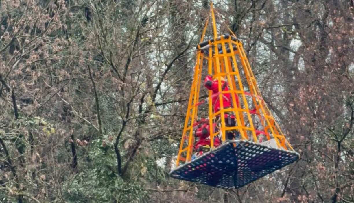 E Sonndeg am Nomëtteg war de CGDIS zur Hëllef geruff ginn, fir eng Kaz aus engem Bam ze retten. D’Déier hat sech héich uewe verfaangen a war net méi selwer aus senger mësslecher Lag erauskomm. Mat engem Kran konnten d’Pompjeeën d’Kaz aus dem Bam retten.