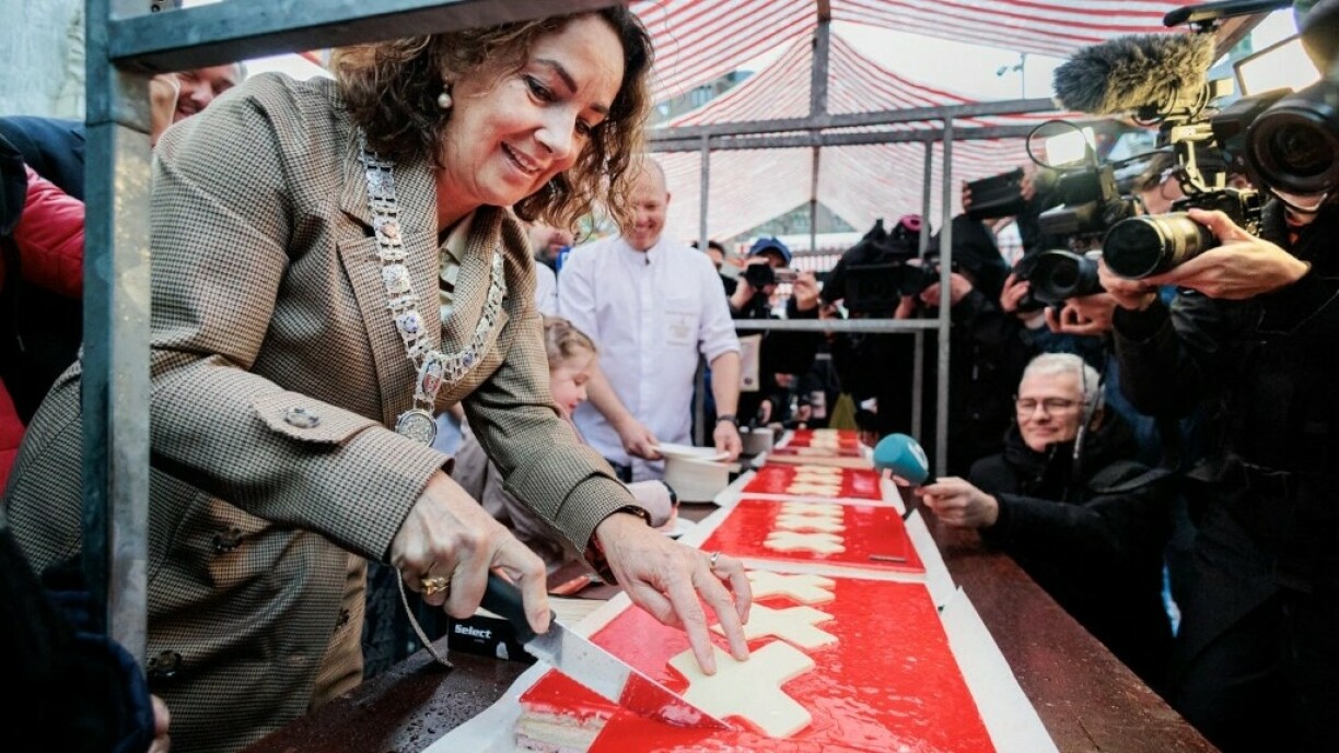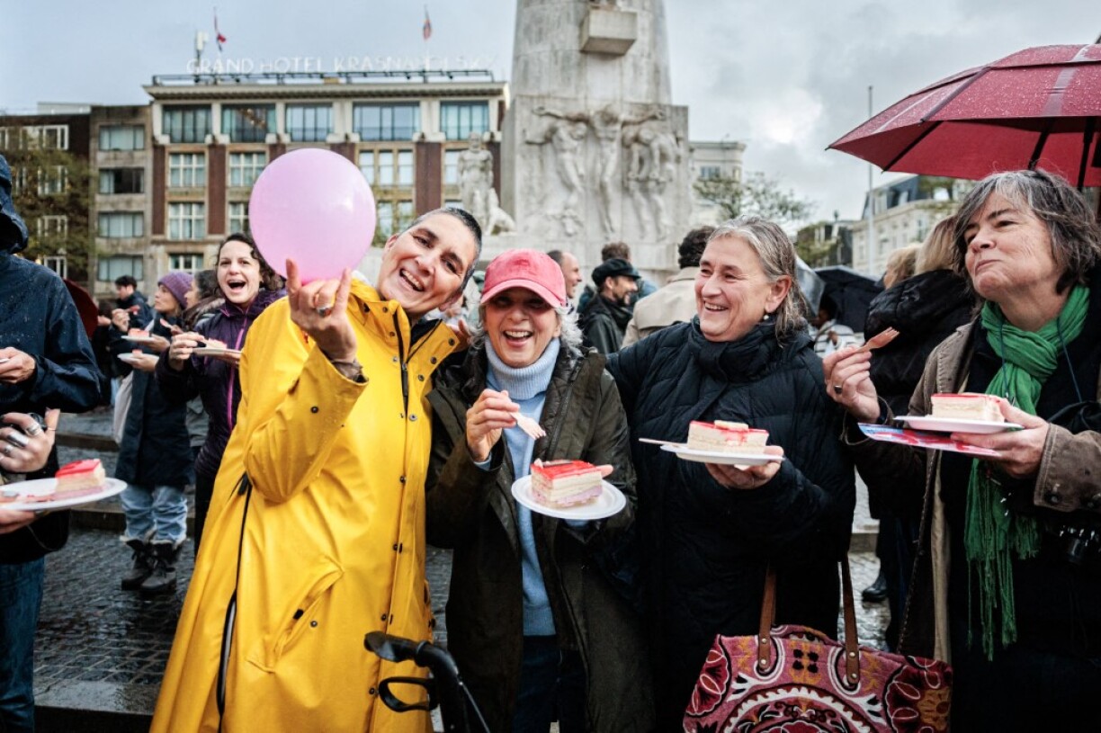 Um 7.50 Auer huet an deem Sënn d’Amsterdamer Buergermeeschtesch Femke Halsema um Dam, der zentraler Plaz vun der Haaptstad, eng 75 Meter laang Taart ugeschnidden. Déi rekordverdächteg Taart mam Wopen drop war an de Faarwe rout a wäiss vun der Stad gehalen a gouf dono a sämtleche Quartieren un d’Leit verdeelt.
