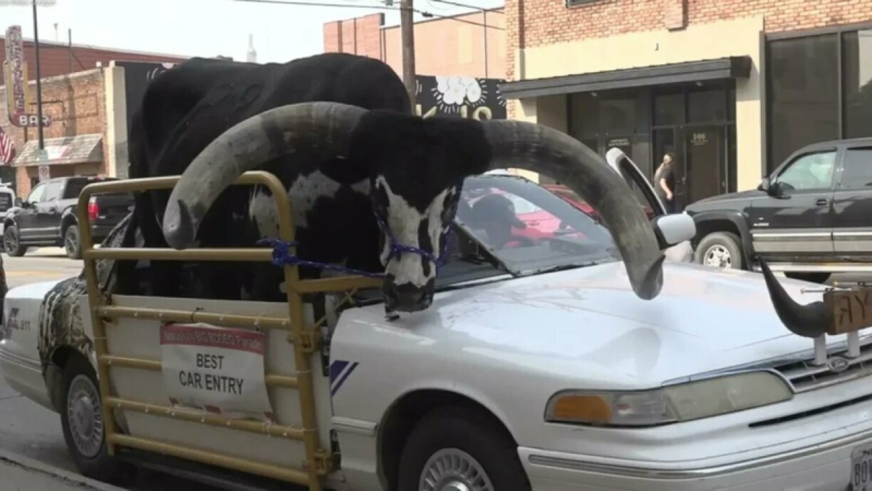 Wou bei anere Mënschen als Bäifuerer am Auto sëtzen, stoung beim Lee Meyer aus Neligh am US-Bundesstaat Nebraska e Mëttwoch e liewege Stéiere mat meterlaangen Haren. Bei der Police koum de Mann lokale Medien no trotzdeem mat e puer Verwarnungen dovun.
