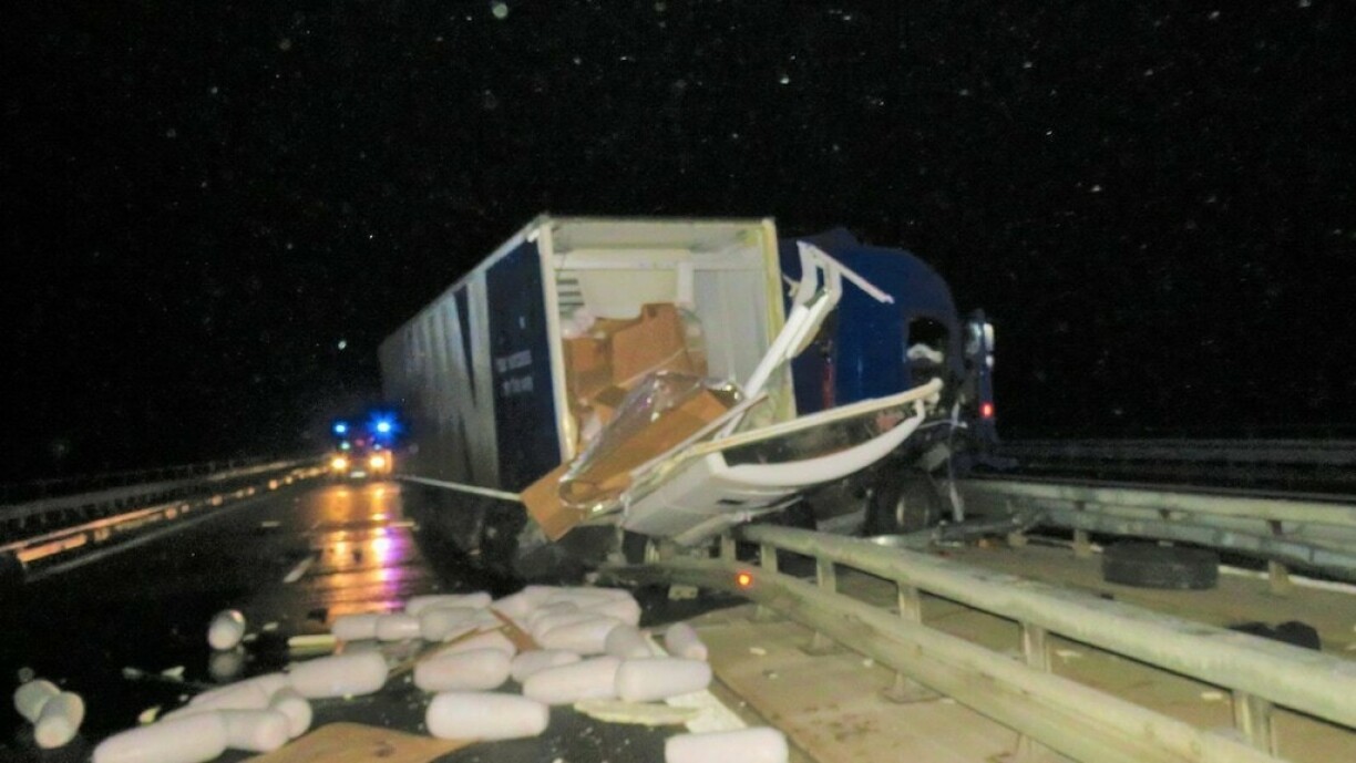 De 40 Tonner war mat 21 Tonne Kebabfleesch belueden, wouvun en Deel beim Accident op d’Fuerbunn gefall ass. E Renault, deen hannert dem Camion war, gouf beschiedegt, wéi den Auto iwwer d’Spiisse gefuer ass.