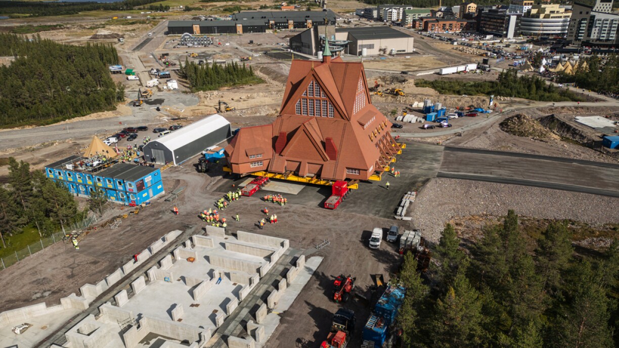 Zwee Deeg zidderen a fënnef Kilometer am Schleekentempo: Déi weltberüümt Kierch vu Kiruna an Nordschweden ass erfollegräich op hiren neie Standuert bruecht ginn. Dausende Leit hunn e Mëttwoch d’Arrivée vun der rouder Holzkierch suivéiert. Déi 40 Meter breet a 672 Tonne schwéier Kierch war an engem Stéck vum ale Standuert op hir nei Heemechtsplaz bruecht ginn. Fënnef Kilometer leien tëscht béide Plazen.