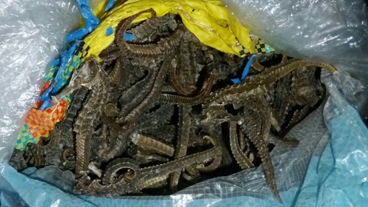 Wéi d’Douane de verdächtege Pak opgemaach huet, sinn d’Beamten op 844 gedréchent Séipäerd gestouss. D’Wuer hat e Gewiicht vun am Ganze ronn 5 Kilo.