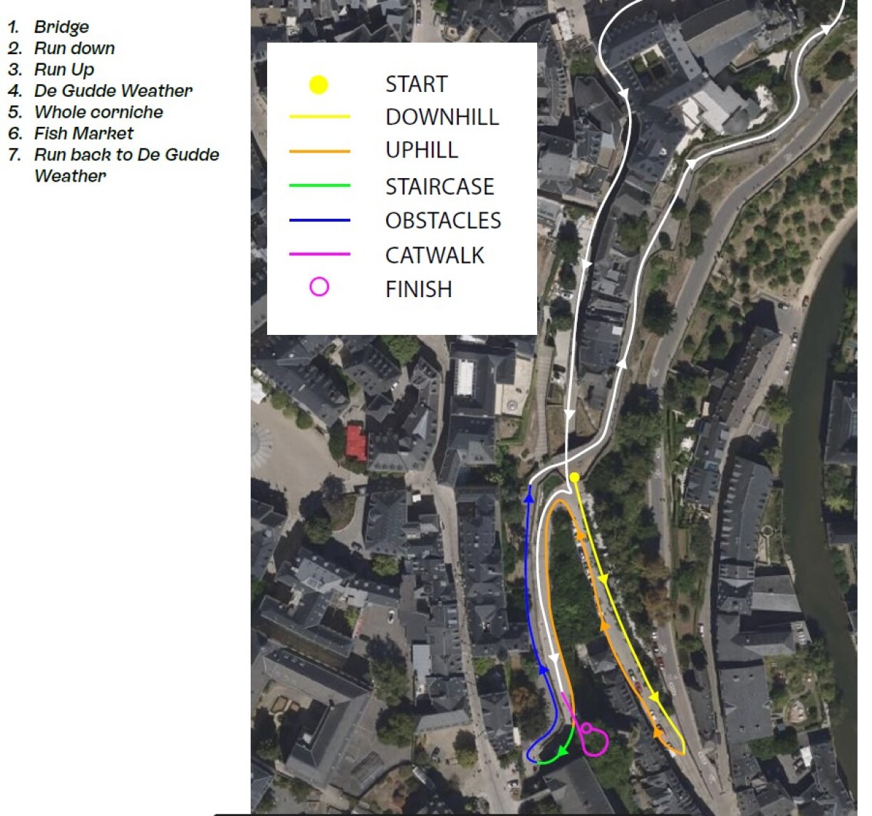 An där Course sinn och Hindernisser an ee Catwalk um Enn virgesinn. Et gi Präisser fir déi éischt Leit am Zil, mee och Déi mat der beschter Manéier ze goen oder déi mat der gréisster Quantitéit vun Alkohol, déi nach an de Glieser iwwreg bleift.