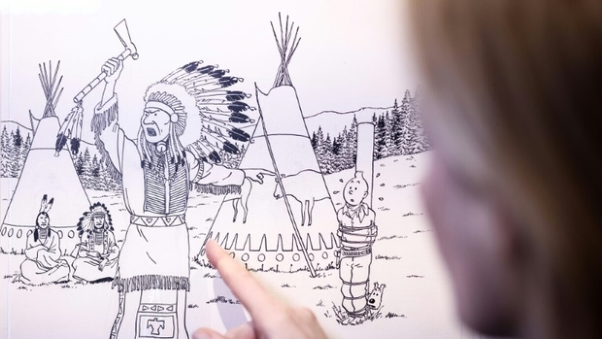 Et handelt sech dobäi ëm d’Titelblat vum Comic “Tintin en Amérique”, deen 1932 fir d’éischte Kéier publizéiert gouf. Dëse gouf an der Vergaangenheet kritiséiert, well déi indigeen amerikanesch Bevëlkerung stereotyp duergestallt gëtt.