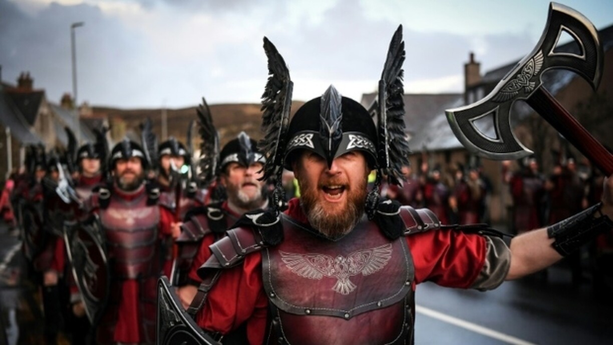 D’Wikinger sinn am spéiden aachte Joerhonnert op de Shetlandinselen agefall an hunn do iwwer 600 Joer geherrscht. Den Organisateuren no gëtt de Festival “Up Helly Aa” zanter dem 19. Joerhonnert gefeiert. Antëscht zitt et och ëmmer méi Touristen op d’Inselen, fir sech déi immens Parad unzekucken.