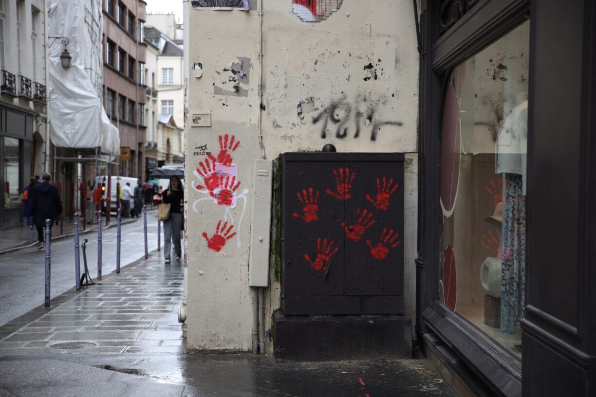 Mat roudem Graffiti a Form vun Hänn hunn Onbekannter d’Gedenkmauer an aner Plazen am historesche Quartier Marais besprayed, an deem traditionell vill Judde wunnen. Dat ënnert anerem op Schoulen a Maison-relaisen.