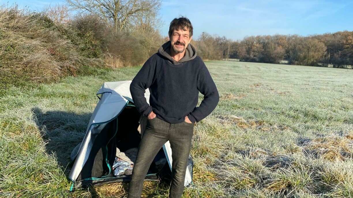 An de Felder tëscht Beetebuerg a Fréiseng, steet zanter e puer Wochen e klengt wäisst-grot Zelt. Hei wunnt den Denis S., 51 Joer, gebierteg vu Jork a Niedersachsen, just eng hallef Stonn vun Hamburg ewech.