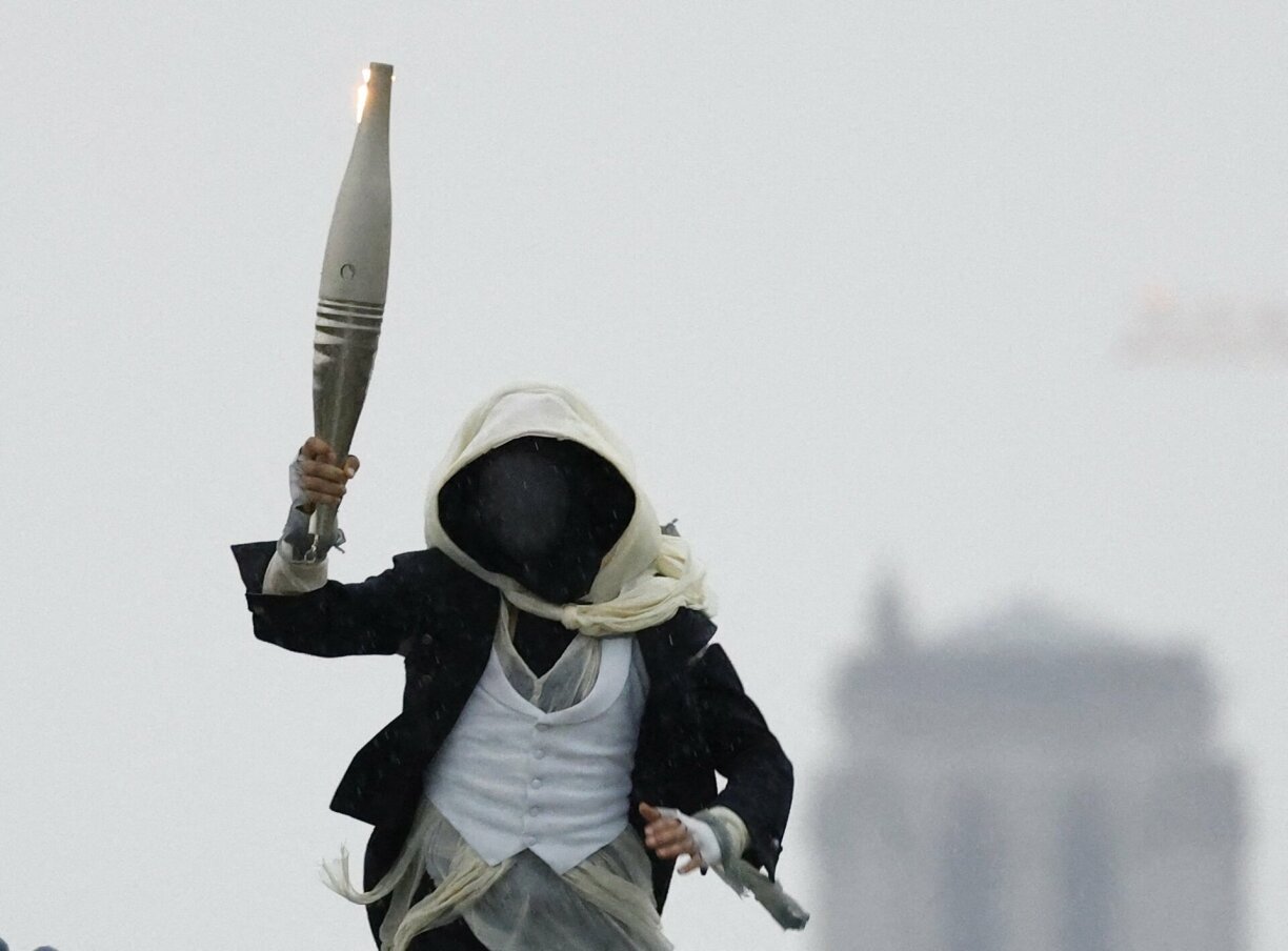Ma wie war déi mysteriéis, mat enger Kaputz maskéiert Persoun, déi mat der olympescher Fakel iwwer d’Diecher vu Paräis, laanscht sëlleg Monumenter vun der franséischer Haaptstad gelaf ass?