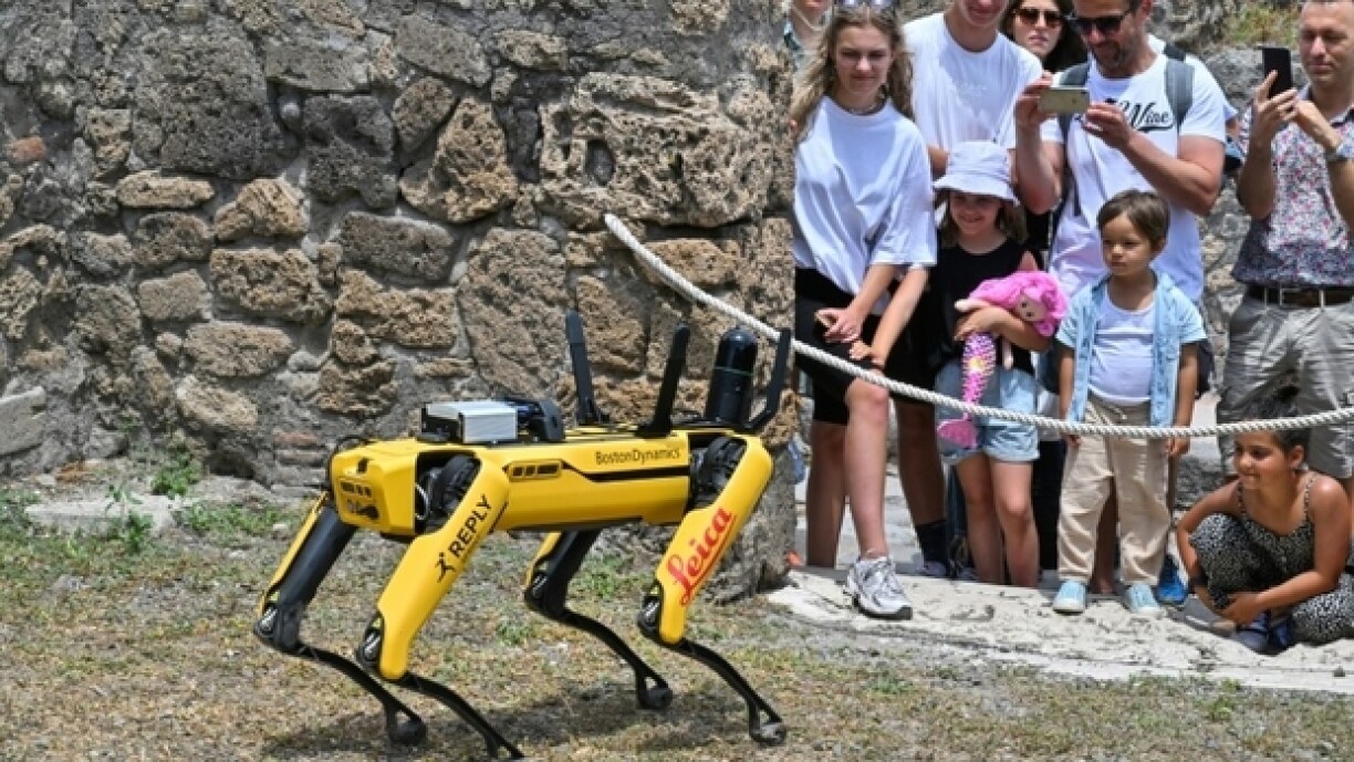 Dat ferngesteiert Déier, dat ausgesäit wéi eng Kräizung tëscht Hond an Insekt, ass dës Woch duerch déi stenge Gaasse vun der anticker Gaass getrëppelt an huet do fir Begeeschterung bei den Touriste gesuergt. De Roboterhond huet och en Numm. De Spot soll déi schwéier zougänglech Beräicher an der grousse Ruinestad inspizéieren, Date sammelen an op Sécherheetsproblemer opmierksam maachen.
