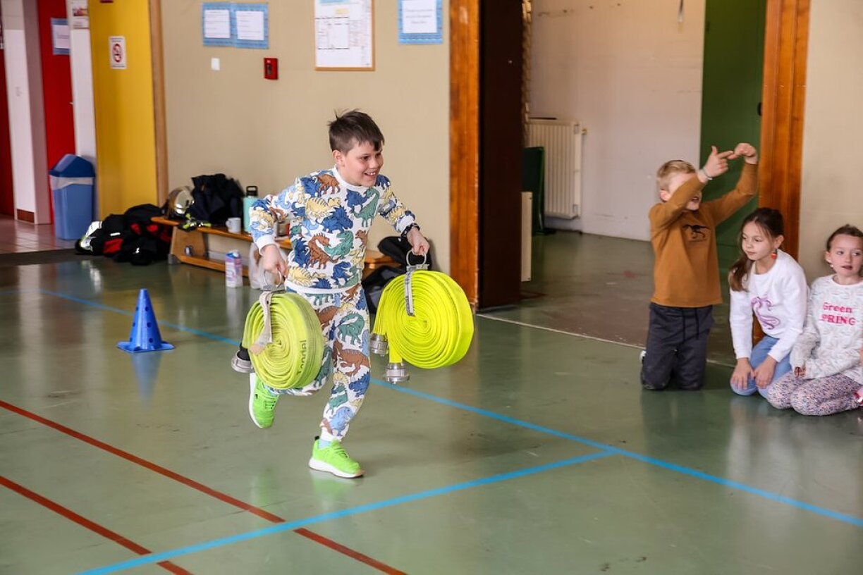An der Turnhal kruten d’Kanner d’Wichtegkeet vun der Sportlechkeet vum Pompjee erkläert a konnten de Parcours d’Agresse, deen am Sportsexame vum Beruffspompjee virkënnt, kandgerecht ausprobéieren.