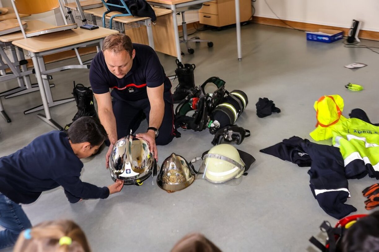 An engem aneren Atelier krute si d’Bestanddeeler vun enger Uniform erkläert a konnte gesinn, wéi aus engem einfache Pompjee een Otemschutzdréier gëtt.