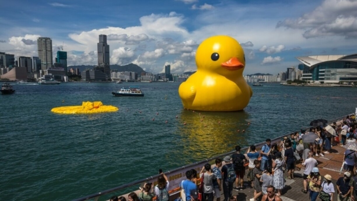 Aus enger vun den zwou risege giele Gummi-Inten am Hafe vun Hongkong huet e Samschdeg missen d’Loft erausgelooss ginn, fir se virun der massiver Hëtzt ze schützen, wéi d’Organisateure vun der Installatioun vum hollännesche Kënschtler Florentijn Hofman matgedeelt hunn. D’Haut vun der plastiks Int hat sech déi waarm Loft bannendran iwwerdeent.