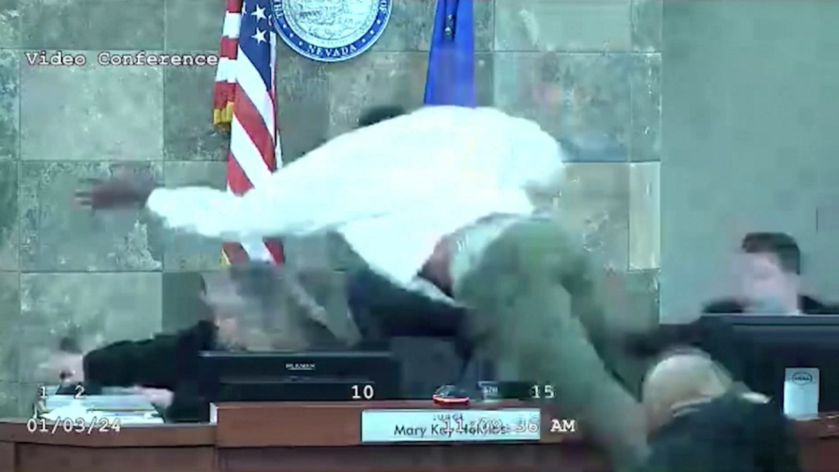 Just an deem Moment, wéi d’Riichterin erkläert huet, dass si eng Strof op Sursis refuséiert, koum och schonn den Ugekloten op si duer gesprongen. Hien ass duerch d’Ofspärung gestiermt an huet d’Riichterin attackéiert.