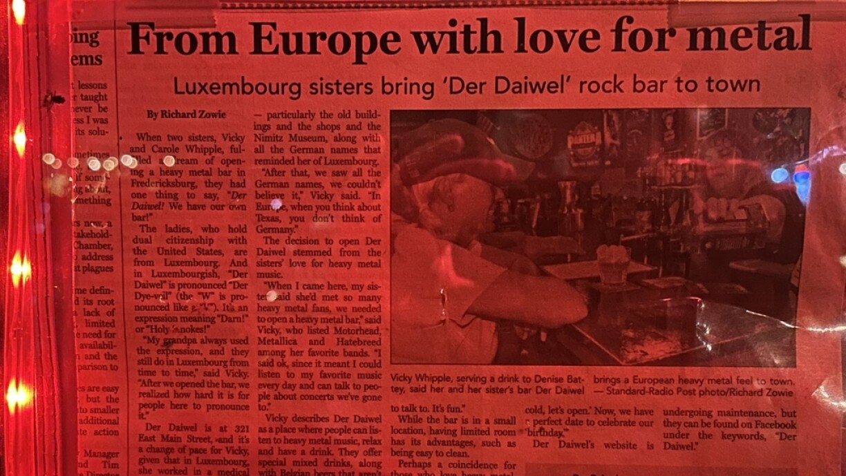 Méi ongewinnt ass do schonn e Schëld mat rouder Schrëft iwwert der Entrée vun engem klenge Gebai mat enger schwaarzer hëlzener Fassad. “Der Daiwel Rock Bar” kann een op dësem liesen. Eng Bar mat lëtzebuergeschem Numm matten am Texas, wat huet et domat op sech? Ma hannert dësem Café stiechen zwou Lëtzebuerger Schwësteren: D’Vicky an d’Carole Whipple hu sech mat “Der Daiwel” viru bal 12 Joer en Dram erfëllt. Wéi et dozou komm ass, dass si e Café mat Fokus op Rock- an Heavy-Metal an enger klenger texanescher Stad bedreiwen, huet d’Vicky Whipple mir am Interview verroden.