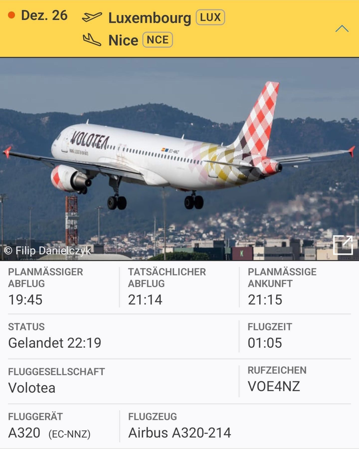Op diversen Tracking-Plattforme gesäit een, dass de Fluch net wéi geplangt um 19.45 Auer gestart ass, ma eréischt no 21 Auer. En ass um 22.19 Auer zu Nice gelant, deemno mat iwwert enger Stonn Verspéidung.