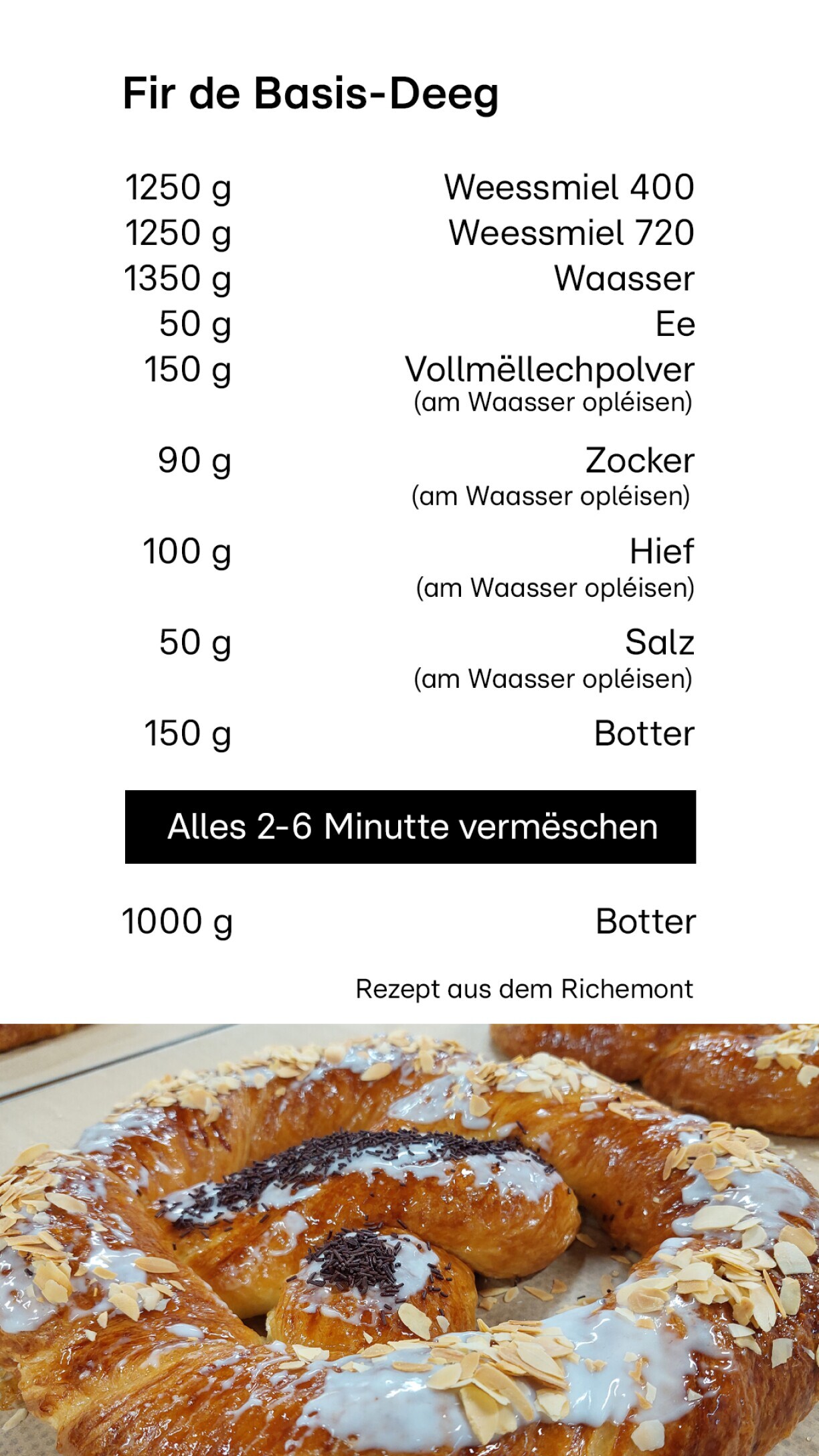 Hei drënner fannt dir déi genee Oplëschtung vum Rezept fir de Basis-Deeg vun enger Bretzel. Am Video backt d’Anne aus Anne’s Kitchen an engem Video fir RTL Today eng Bretzel a weist déi eenzel Schrëtt am Detail, sou dass och doheem am Backuewen déi séiss Leckerei geléngt.