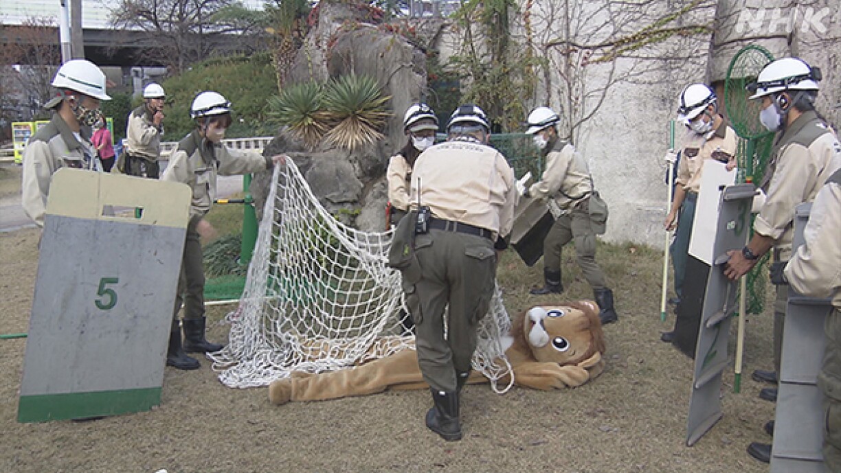 E Mataarbechter vum Tennoji Zoo zu Osaka huet e Léiw-Kostüm ugedoen an huet d’Roll vum ausgebéchsten Déier iwwerholl. Wärend hien ënnert de Blécker vun de Visiteuren op zwee Been duerch d’Anlag stolzéiert ass, hu seng Kolleege mat Helmer, Schëlder an Netzer souwéi der Ënnerstëtzung vu Pompjeeë probéiert, de “wëlle Léiw” erëm anzefänken.