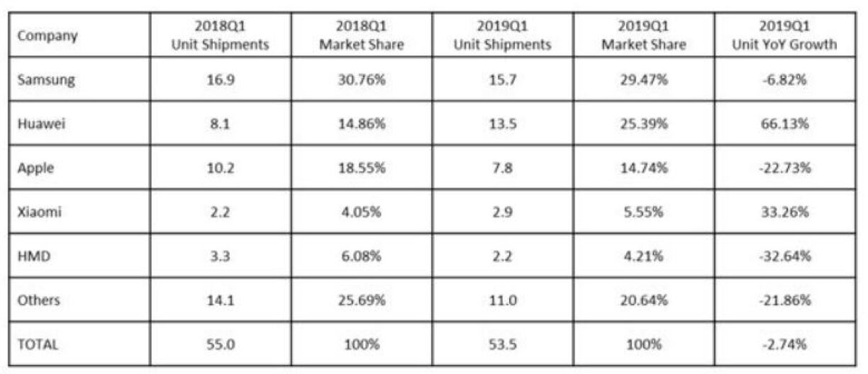 Samsung huet eng Baisse vu 6,82% mat 15,7 Milliounen Unitéiten enregistréiert, bleift awer weiderhin op der éischter Plaz vum Klassement. Op der zweeter Plaz fënnt een déi Mark déi am meeschte gewonnen huet: d’Parte vu Huawei um Marché hunn eng Progressioun vu 66,13% erlieft. De Public huet tëscht Januar a Mäerz 13,5 Milliounen Apparater vun de Chinese kaf. Drëtten ass Apple, mat enger Baisse vun 22,73%. Esou e schlecht Resultat haten d’Amerikaner zanter 5 Joer net méi kannt. Hei goufe 7,8 Milliounen iPhone verkaf.