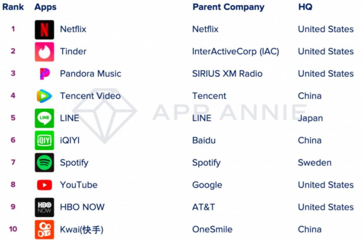Nieft der Fro, wéi eng 10 Déngschter am heefegsten erofgeluede goufen, huet Annie App och ënnersicht, wéi vill Zäit d’User op de jeeweilegen Appe verbréngen. Net ganz iwwerraschend ass de Gewënner Netflix an dëser Kategorie. Opfälleg ass bei dësem Klassement, dass d’Mënschen am meeschten Zäit op Streaming-Déngschter verbréngen, ob Filmer oder Musek. Beléift sinn och d’Streaming-Zerwisser Pandora Music op Plaz 3 an Tencent Video op Plaz 4.