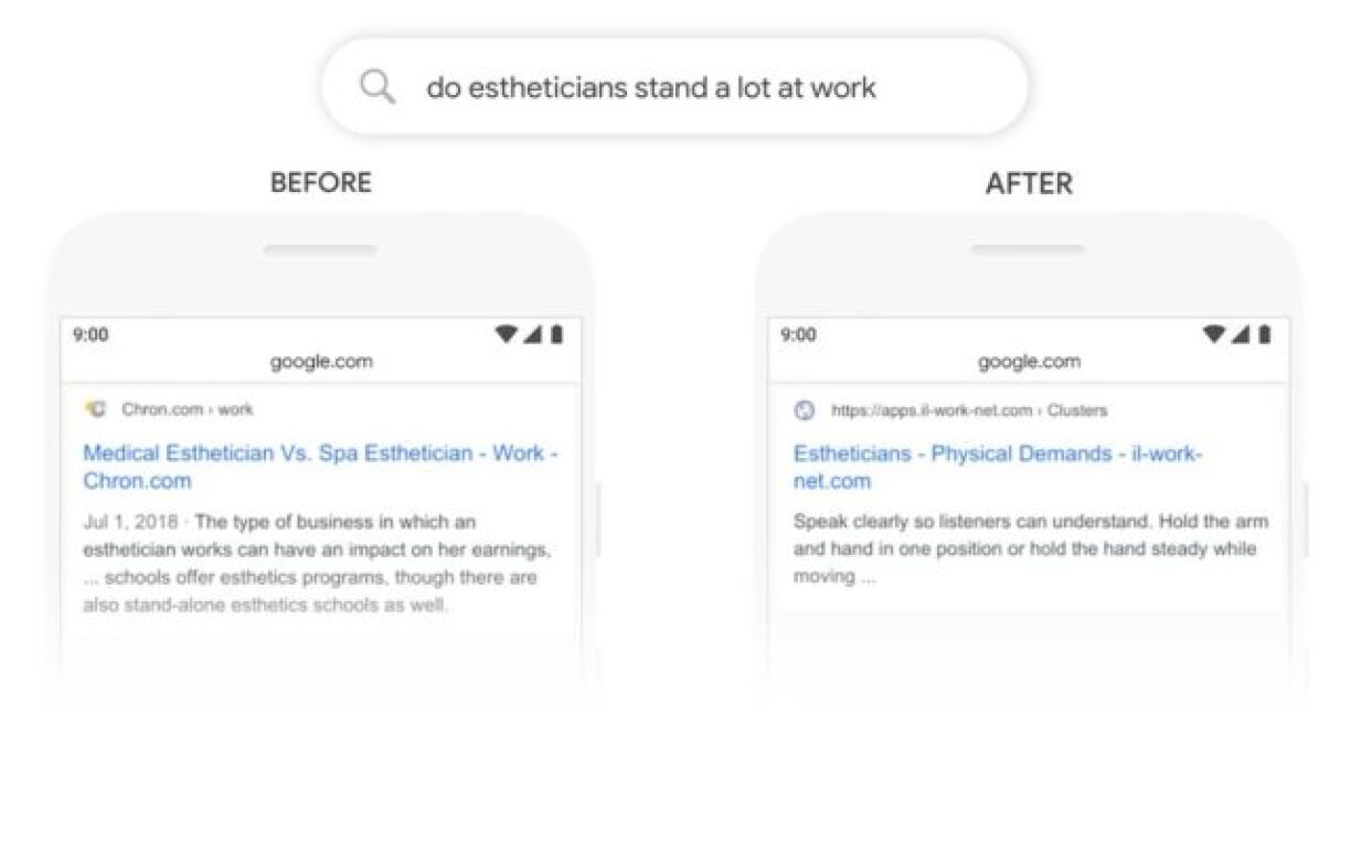 An engem Beispill versteet ee besser, wat den Update bréngt: Mat der Sich “Stinn d’Estheticiennen dacks op hirer Aarbecht” wëll Google tëscht virum an nom Update vergläichen. Mëttlerweil gëtt de Verb “stoen” mat der Sich verbonnen, woubäi déi al Versioun d’Verb éischter ignoréiert hat, fir prioritär Resultater iwwer Estheticiennen unzeweisen.