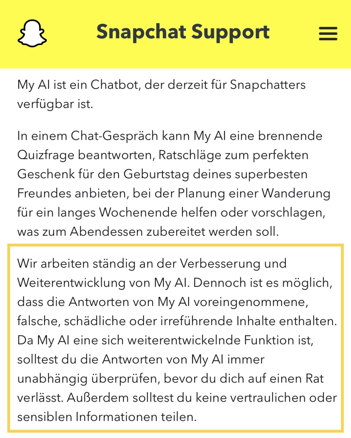 De Snapchat-Support mécht hei dann och dorop opmierksam, dass een net alles fir Boer Mënz huelen dierf, wat “My AI” enger verzielt: “Dennoch ist es möglich, dass die Antworten von ‘My AI’ voreingenommene, falsche, schädliche oder irreführende Inhalte enthalten.”