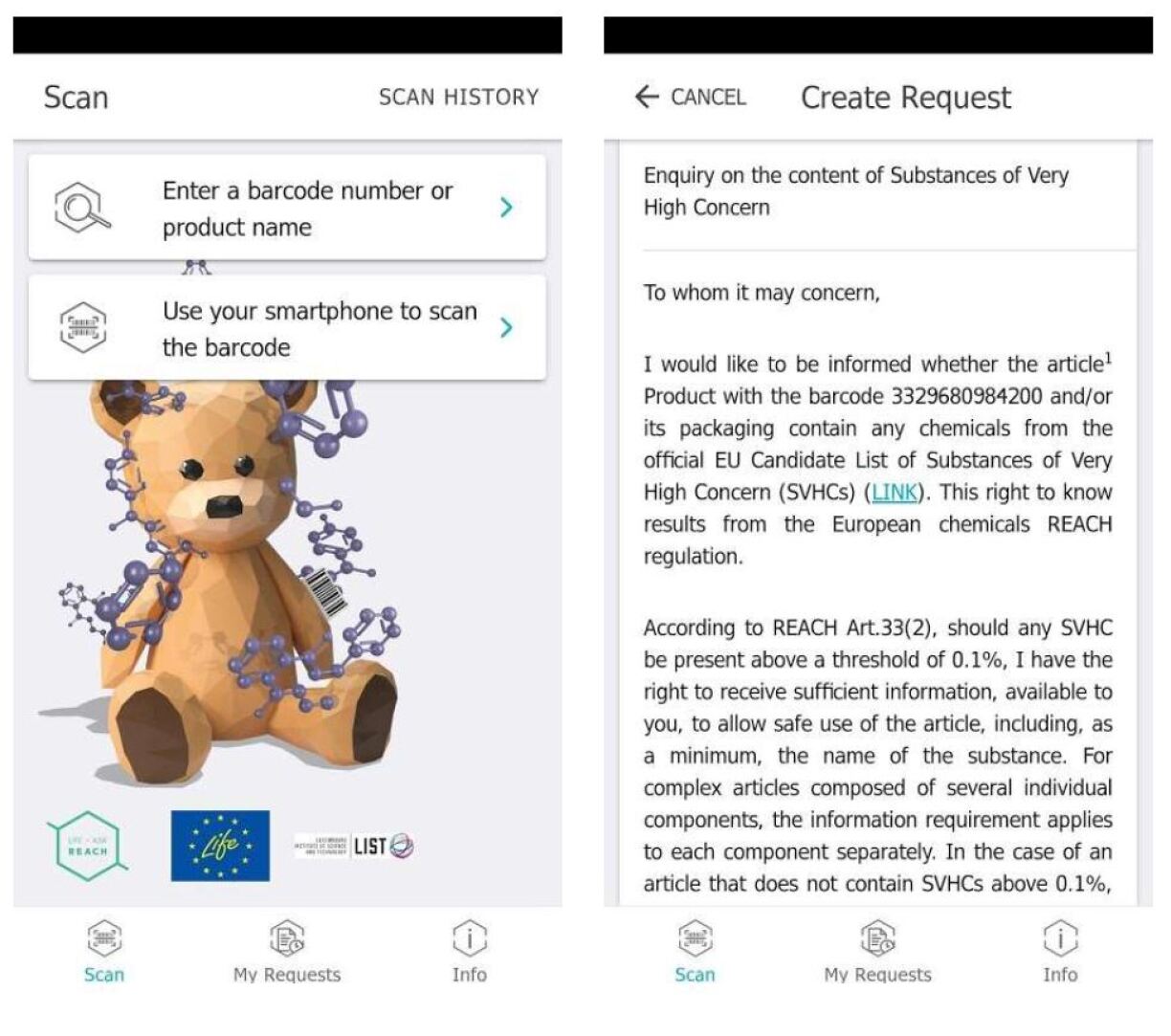Europäesch Bierger musse wëssen, wat se kafen a wat fir Konsequenze verschidde Produiten hunn. Den Artikel 33 vum europäesche Reglement iwwer chemesch Substanzen ass kloer: Firme mussen Informatioune iwwer bedenkleche Substanzen, déi a Produite present sinn, matdeelen. Wann ee User vun der App eng Demande vun Informatiounen un ee Fournisseur schéckt, muss dëse bannent 45 Deeg eng Äntwert liwweren.