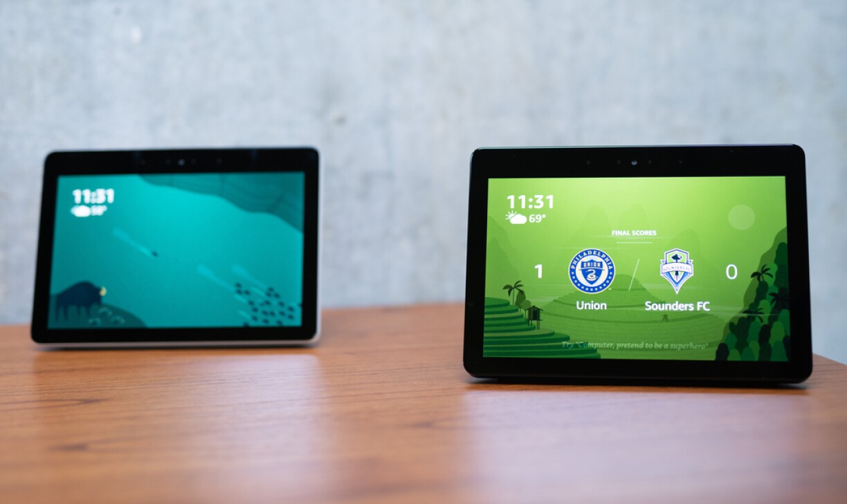 Een Ecran ass hei wichteg, fir u méi Informatiounen ze kommen. An et ass och d’Méiglechkeet fir Amazon, sech an de Smartphone- an Tablett-Marché eranzeschläichen. Wann een hei nom Wieder freet, kritt ee genee Temperature mat Grafike gewisen. Wann ee Musek lauschtere wëll, kritt een och de Video-Clip iwwer d’Vevo-Plattform ugewisen. Et kann een och iwwer dëse neien Objet Tëlee kucken, e Rezept Schratt fir Schratt an der Kiche verfollegen a wann d’Hänn ze knaschteg sinn, kann een dat Ganzt och mat der Stëmm steieren. Amazon proposéiert iwwer 1.000 Applikatiounen (Skills) fir de System.