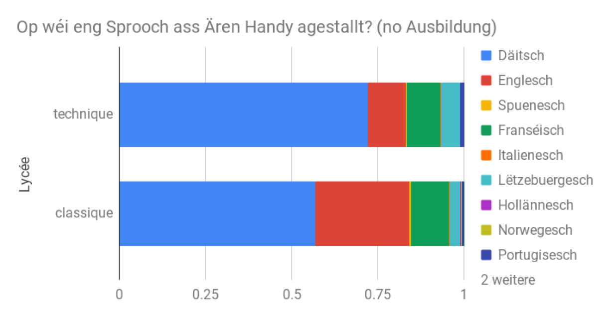 Nieft dem Facteur Alter spillt och d’Ausbildung eng Roll: Däitsch huet d’Nues vir, egal ob een am Classique oder op Général war respektiv ass. Wärend de Prozentsaz vum Franséische bei béide Schoultyppen ongeféier identesch ass (6%), ass den Undeel vum Englesche bei Persoune vun engem Classique däitlech méi héich an dee vum Däitschen entspriechend méi déif. “Et kann een heiraus schléissen, dass an der méisproocheger Kompetenz vum Lycée Classique d’Englescht eng méi wichteg Roll kritt”, esou de Peter Gilles op Infolux.uni.lu.