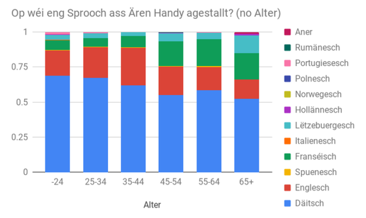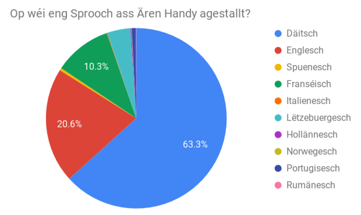 Déi éischt Auswäertung presentéiert direkt eng Iwwerraschung: Et verwonnert net, dass d’Majoritéit vun 63% hiren Handy op Däitsch agestallt hunn, mä opfälleg ass, dass just 10% Franséisch a bal duebel sou vill Englesch gewielt hunn.