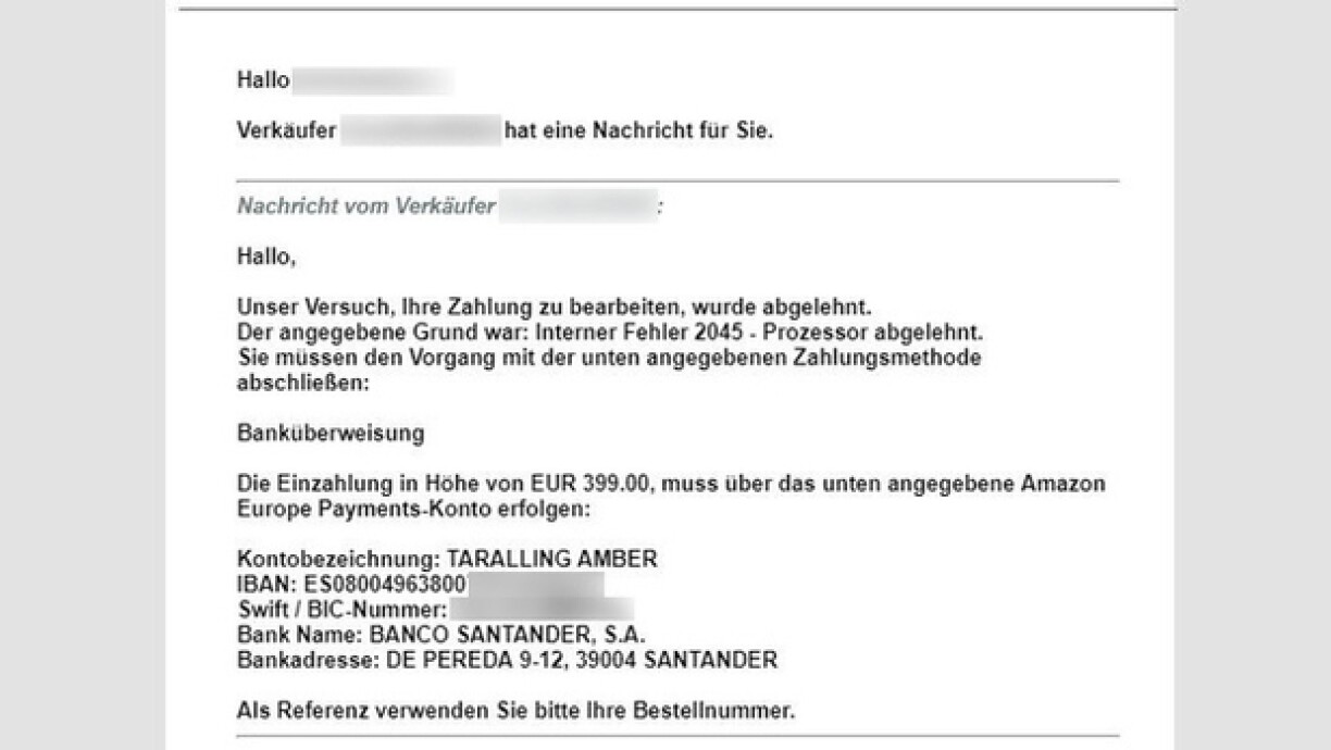 Da fuerderen déi Onéierlech de User op, fir d’Suen un en Amazon Europe Payments-Konto ze iwwerweisen, dee bei iergendenger Bank opgemaach gouf.