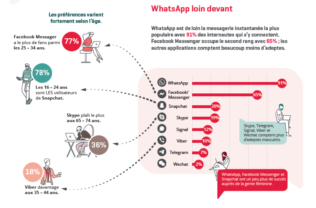 De beléiftste Messenger-Déngscht zu Lëtzebuerg ass iwwerdeems Whatsapp. 91 Prozent vun de Lëtzebuerger, déi e Messenger notzen, sinn op dësem Déngscht ënnerwee. 65 Prozent notzen dogéint de Facebook-Messenger. Op der drëtter Plaz steet Snapchat mat 20 Prozent. Am mannste benotzt ginn d’Déngschter Telegram (7 Prozent) a Wechat (2 Prozent).