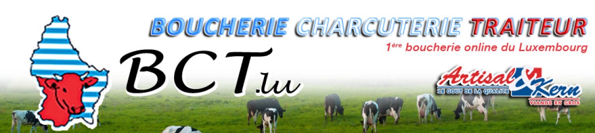 BCT.lu – d’Ofkierzung steet fir Boucherie, Charcuterie an Traiteur – ass ee séchere Wee fir sech mat frëschem Fleesch, Charcuterie a gefruerenem Fësch anzedecken! Doheem an aller Rou um PC bestallt, liwwert Artisal&Kern vu Méindes bis Freides a Confirmitéit vum HACCP. Ab engem Bestellwäert vun 80 € kritt Dir Är Commande bei d‘Hausdir geliwwert. Regional Produkter, mat héiger Qualitéit, an doniewt och exklusiv dat besonnesch gesond Fleesch vum letzebuerger Strauss.